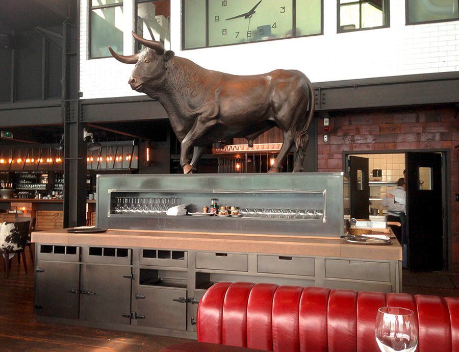 Un Taureau grandeur nature trônant au centre de la salle du Restaurant